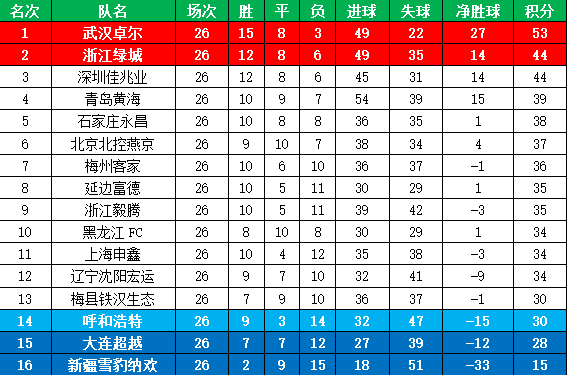 9月29-30日,2018中甲联赛展开第26轮角逐。武汉卓尔客场2-2被延边富德逼平,放缓了冲超脚步。浙江绿城客场5-1大胜新疆雪豹纳欢排名次席,主队提前4轮降入中乙。深圳佳兆业客场3-1力克梅州客家,积分与浙江绿城持平位列第3。