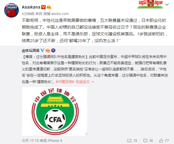 Asaikana说道:不敢苟同,中性化这是早就需要做的事情,五大联赛基本没遇过,日本职业化初期就完成了。中国人却惯的自己都没法接受不靠冠名过日子?现在的联赛是企业联赛,投资人是主体,而不是俱乐部,足球文化建设极其落后。1岁就该断奶的,结果25岁了还不断,还问“都喝25年了,没奶怎么活?”