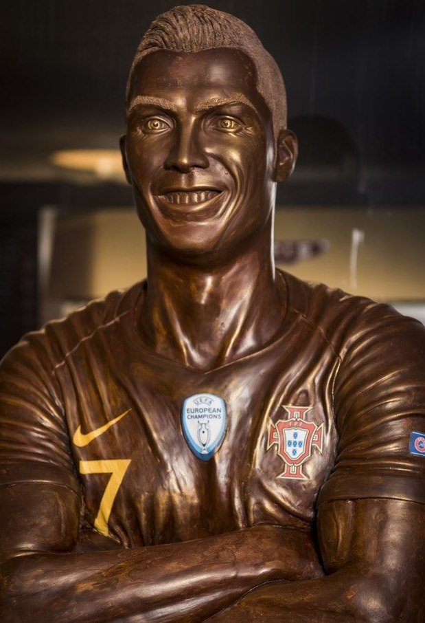 近年来,各国艺术家经常制作C罗造型的雕像。其中有写实派,但也有不少属于鬼畜派。如今一名葡萄牙巧克力制作师,用巧克力制作了一尊C罗雕像。