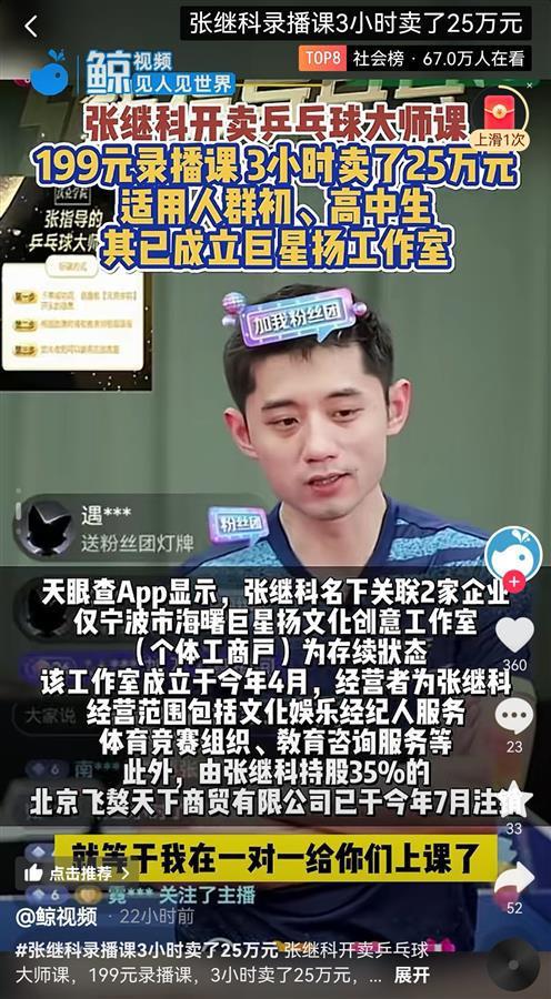 据蓝鲸新闻报道,近日,乒乓球奥运冠军张继科在名为“张指导乒乓球”的颤音账号上播。当天,他不仅推出了自己的新代言运动品牌,还上架了199元的“张继科乒乓球大师班”。他说:“如果你买了我的课程,只要你努力学习,你一定会得到一个球,这意味着我会一对一地给你上课。”。