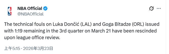 北京时间3月23日,NBA正式宣布,3月22日第三节剩下1分19秒后,被授予湖人队的东契奇和魔术比塔泽的技术犯规已经正式撤销。这也意味着东契奇的第16个技能犯罪分子已经被撤销,他将不会在周二对阵活塞的比赛中被禁赛。