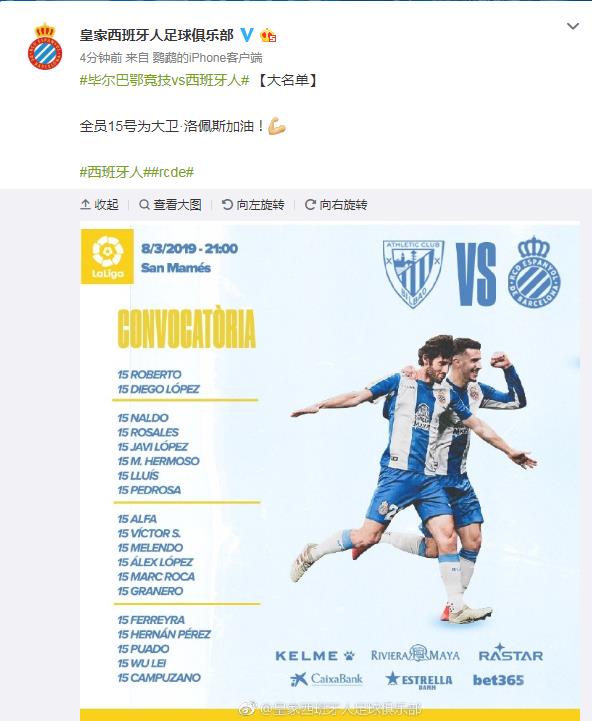 常规操作!西班牙人公布客战毕尔巴鄂名单 武磊入围
