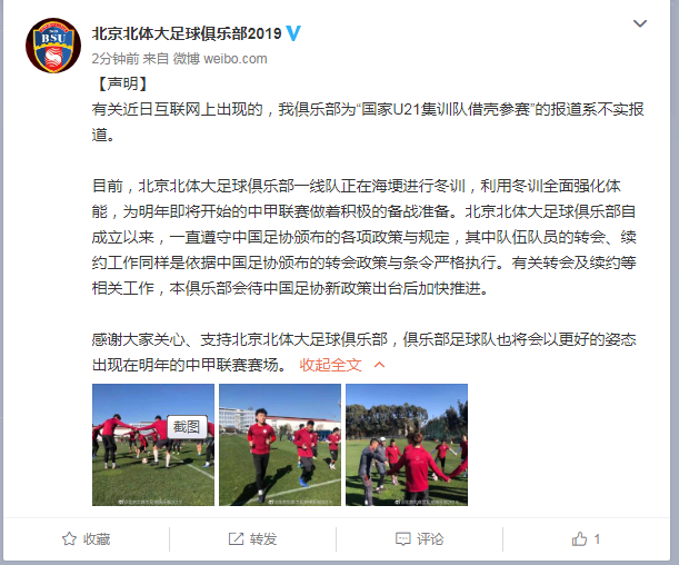 有关近日互联网上出现的,我俱乐部为“国家U21集训队借壳参赛”的报道系不实报道。
