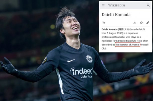 镰田大地的维基百科被改成“阿森纳解放者”