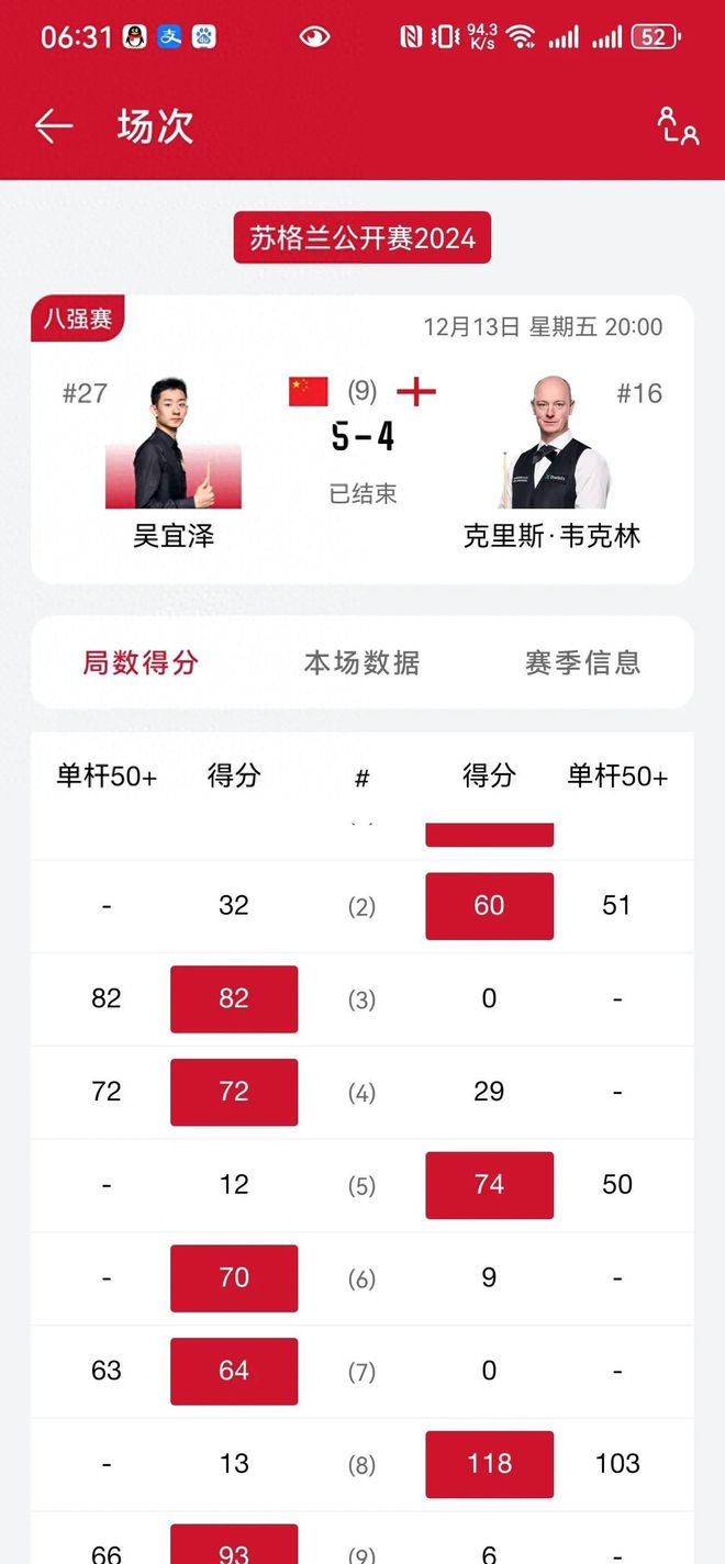 苏格兰公开赛四强出炉,韦克林绝杀落败,布雷切尔惨遭横扫!