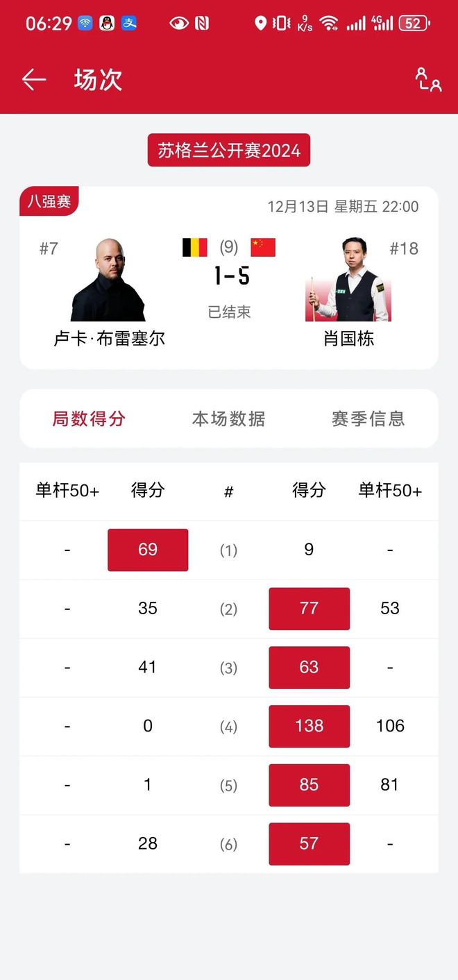 接下来的五场比赛已经成为肖国栋的表演时间,卢卡布雷切尔在接下来的五场比赛中不断犯错。肖国栋主动抓住了机会,不仅让自己昂首晋级苏格兰公开赛半决赛,也创造了他在苏格兰公开赛的最佳成功。此外,他也很成功。丁俊晖为队友完成了复仇之战。而且卢卡布雷切尔的世界排名明显高于自己,进入半决赛也让他重新回到了世界前16的行列,重新燃起了希望。