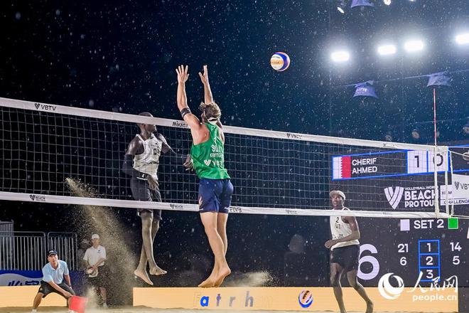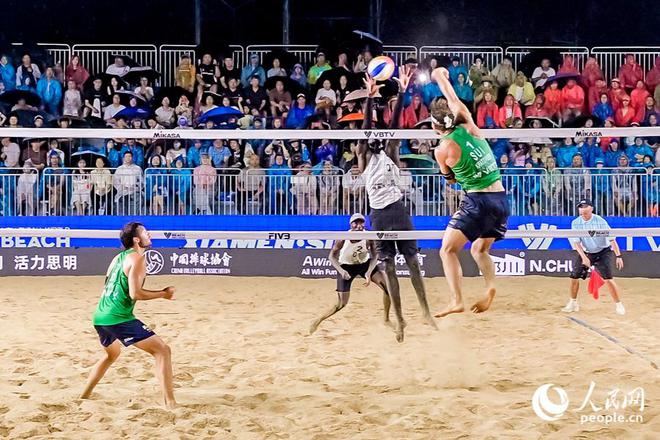 决赛当晚,现场气氛紧张,球场上的球员全力以赴,比分粘在一起,成千上万的观众为球员在沙滩上的每一次精彩扣球和救球欢呼雀跃...在此期间,天空突然下起了大雨,湿滑的沙滩增加了移动的难度,但球员们依然冷静积极,充分展示了沙滩排球的激情和高水平比赛。
